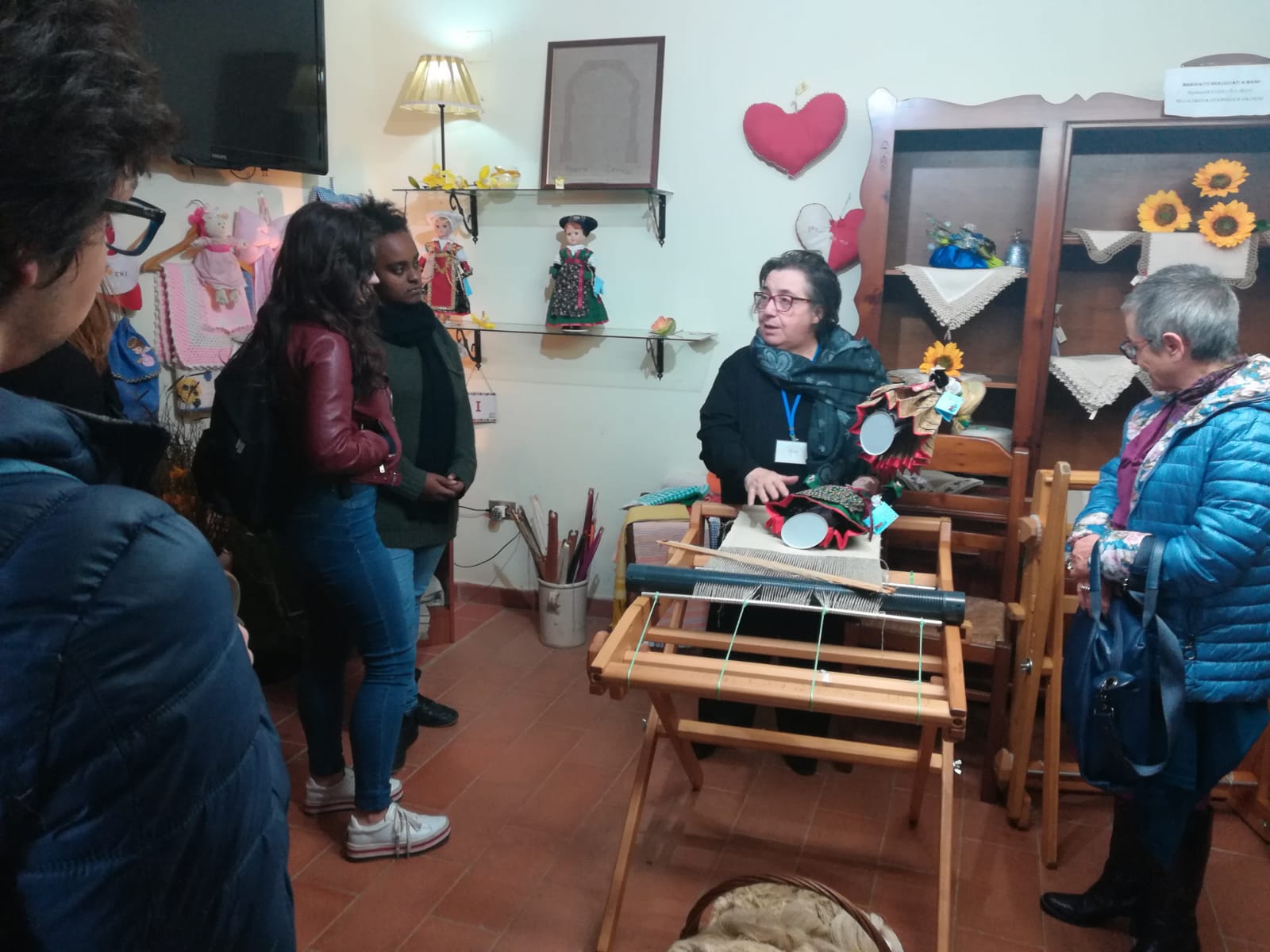 Tina Galderisi, una delle responsabili del Laboratorio Tessile, illustra il funzionamento del telaio manuale.